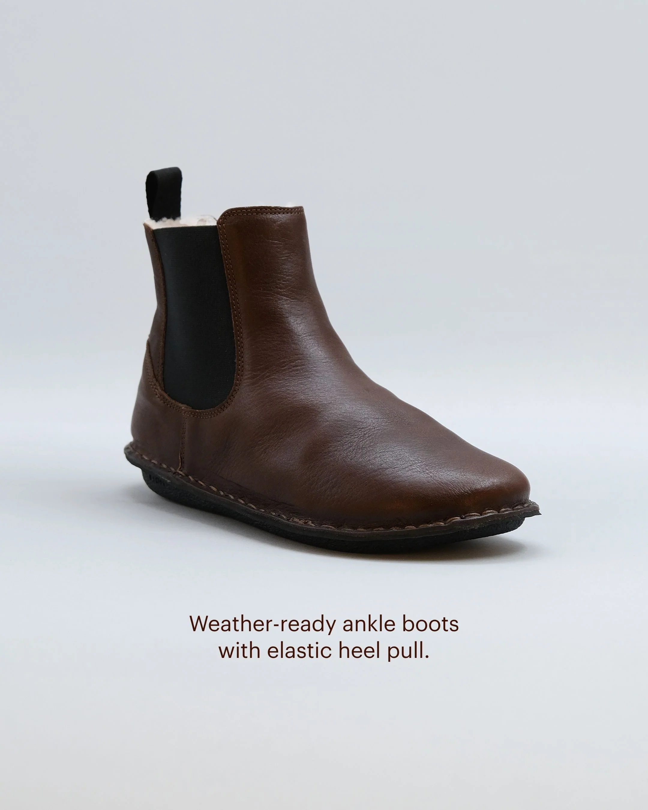 When the temperature drops, the HELSINKI Shearling steps up. Lined with plush, breathable shearling, these above-ankle Chelsea boots keep your feet warm without overheating. The easy pull-on design with flexible side panels makes them a go-to for busy days, while the form-fitting silhouette shapes to your feet with wear. Whether you're heading to the office, exploring nature, or walking the city streets, these boots move with you in comfort and style. Lovely to wear without socks too!